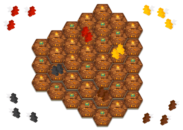 In Ursa Miner, the battleground is Mount Honeycomb — a three-layer stack of hex tiles loaded with sweet rewards. Each player begins with two bears, placed on a single stack, ready to dig.